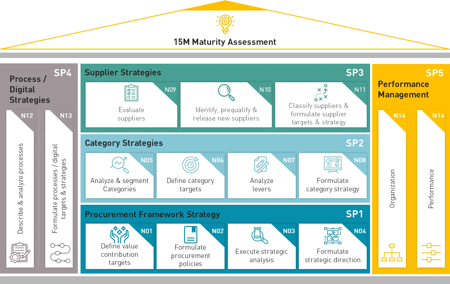 is to analyze the status of the procurement in your organization. This is accomplished with the 15M Maturity Assessment.